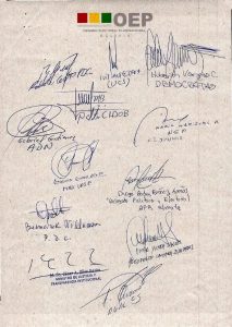 Entre los compromisos más destacados están la renuncia de los partidos al financiamiento estatal para la campaña electoral, la revisión del padrón electoral y la promoción de una ley de participación en los binomios presidenciales.