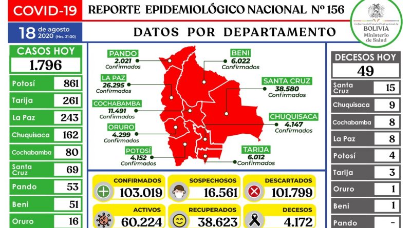Este martes, el Ministerio de Salud reportó 1.796 nuevos casos de COVID-19, con un total acumulado de 103.019 contagios en todo el país, siendo el departamento de Potosí con mayores infectados en esta jornada con 861. la paz, 18 agosto 2020.