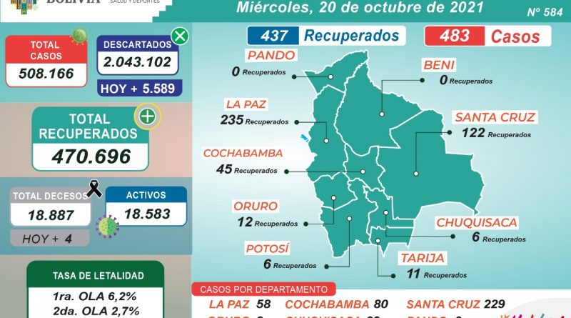 El Reporte N° 584 del Ministerio de Salud y Deportes informó que la cifra de contagios de COVID-19 en el país fue de 483 casos este miércoles; mientras que los pacientes recuperados de la enfermedad fueron 437. Los decesos llegaron a 4 y los casos descartados a 5.589 durante esta jornada.