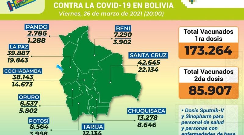 El Ministerio de Salud y Deportes informó este viernes que la cifra de inmunizados con la primera dosis de la vacuna contra el COVID-19 ascendió a 173.264, mientras que los beneficiarios de la segunda dosis suman 85.907.
