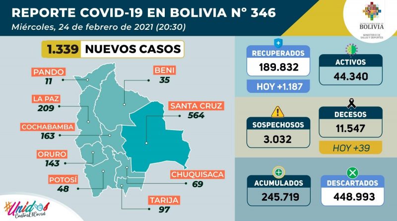 #ReporteOficial | El Ministerio de Salud y Deportes anuncia 1.339 nuevos casos positivos de #COVID19 en #Bolivia este miércoles (24/02/21).