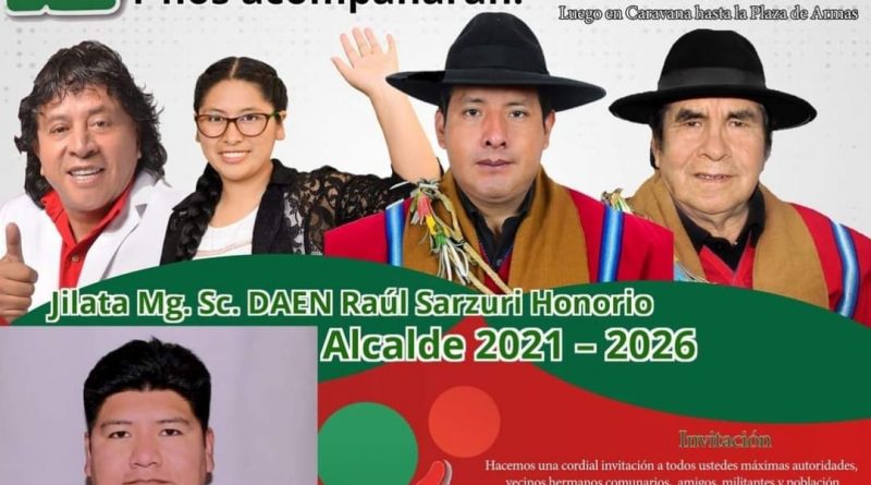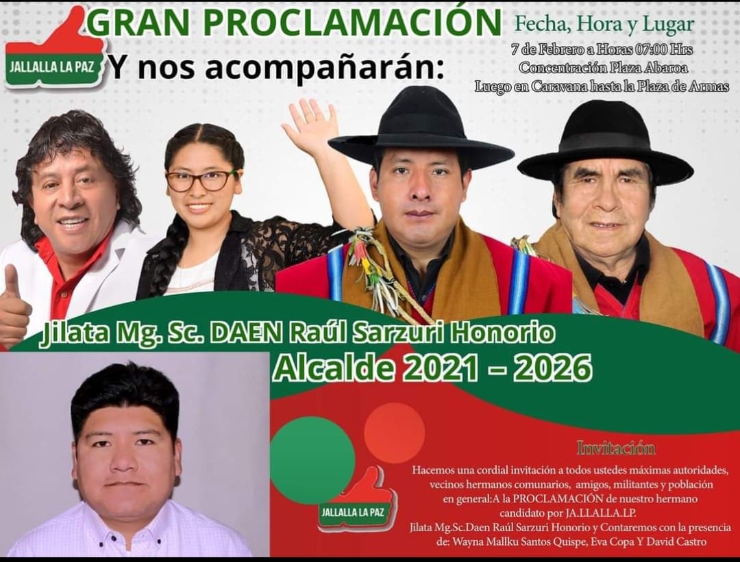 Este domingo 07 de febrero estamos con la gran proclamación de nuestro candidato, Raúl Sarzuri Honorio y contaremos con la presencia del Wayna Mallku Santos Quispe candidato a gobernador de La Paz, la hermana Eva Copa candidata a la Alcaldía de El ALTO, así también de nuestro candidato a la Alcaldía de la ciudad de LA PAZ David Castro.