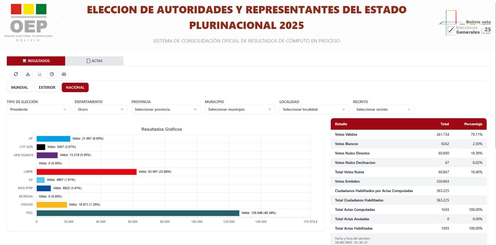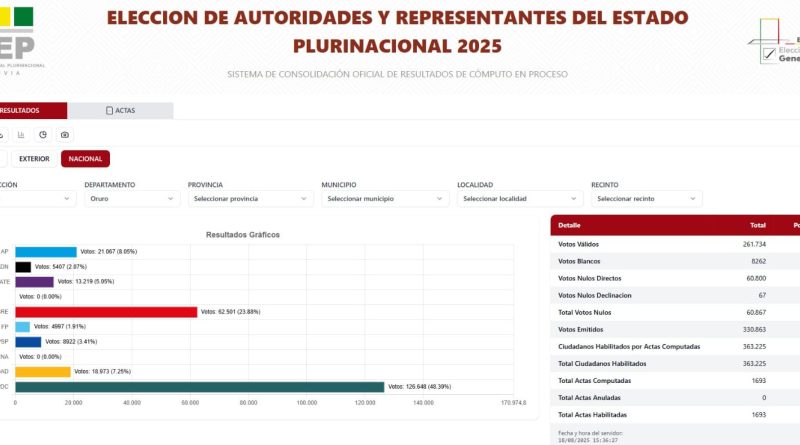 El Tribunal Electoral Departamento (TED) de Oruro concluyó este lunes el cómputo de resultados de las elecciones generales del domingo, dando como ganador al exalcalde de Tarija y senador Rodrigo Paz Pereira con el 48,39% (126.648 votos).