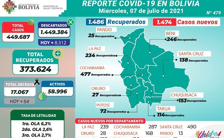 El Ministerio de Salud y Deportes informa que, durante esta jornada: 1.486 pacientes fueron reportados como recuperados de COVID-19 y dados de alta; de acuerdo al diagnóstico masivo, durante esta jornada se realizaron 9.786 pruebas, 1.474 dieron resultado positivo y 8.312 resultaron descartadas.