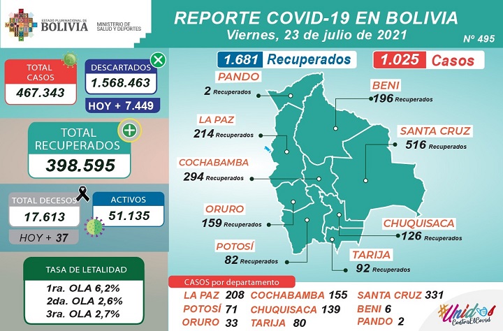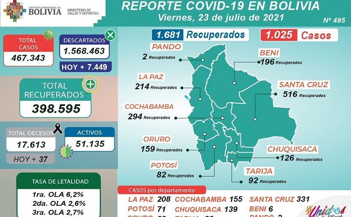 El Ministerio de Salud y Deportes informa que, durante esta jornada: 1.681 pacientes fueron reportados como recuperados de COVID-19 y dados de alta; de acuerdo al diagnóstico masivo, durante esta jornada se realizaron 8.474 pruebas, 1.025 dieron resultado positivo y 7.449 resultaron descartadas.