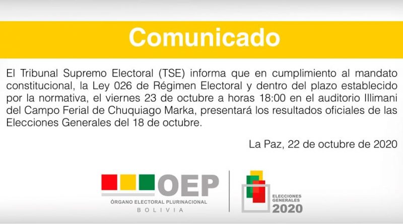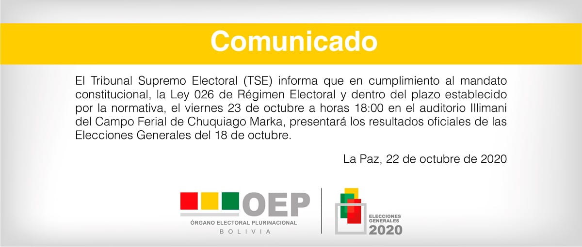 “En cumplimiento al mandato constitucional, la ley 026 de Régimen Electoral y dentro del plazo establecido por la normativa, el viernes 23 de octubre a horas 18:00 en el auditorio Illimani del Campo Ferial Chuquiago Marka, presentará los resultados oficiales de las elecciones”, dice el comunicado.